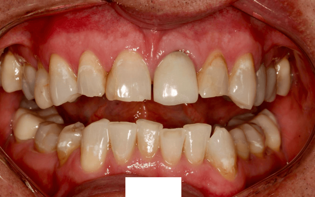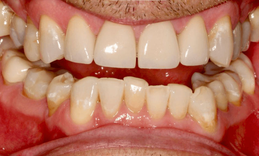 This patient presented with chipped, worn and discoloured teeth. Our dentists began with professional teeth whitening to lighten the patient's teeth before using porcelain crowns and veneers for repair. The custom porcelain restorations blend seamlessly with the patient's whitened teeth, creating a brighter smile upon completion.